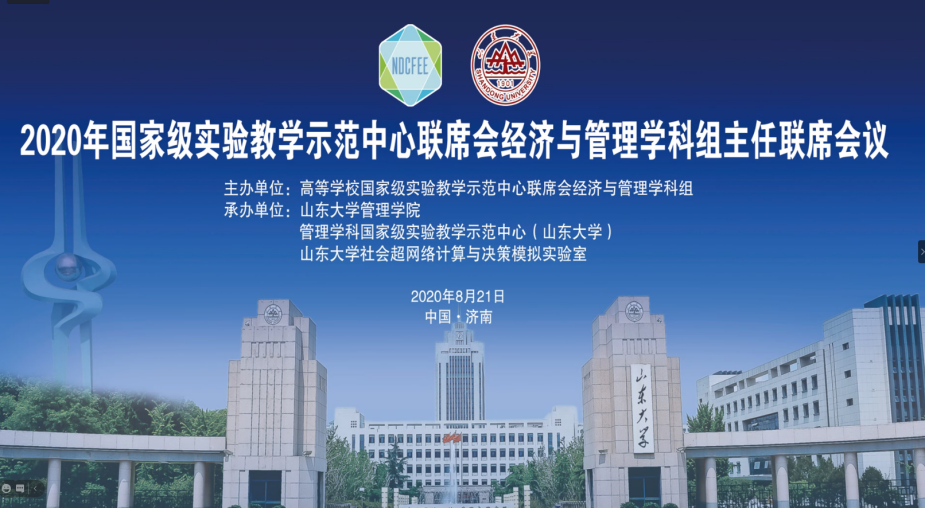 为了进一步做好高等学校国家级实验教学示范中心及国家级虚拟仿真实验教学中心建设和发展的相关工作,发挥国家级实验教学示范中心及国家级虚拟仿真实验教学中心的示范和辐射效应,积极推动新文科背景下经管学科实验教学的发展,按照《高等学校国家级实验教学示范中心联席会议章程(试行)》中的有关规定,由高等学校国家级实验教学示范中心联席会经济与管理学科组(下称学科组)主办,山东大学管理学院、管理学科国家级实验教学示范中心(山东大学)、山东大学社会超网络计算与决策模拟实验室承办的2020年高等学校国家级实验教学示范中心联席会经济与管理学科组主任联席会视频会议于8月21日在济南召开。全国60多家高校经管类国家级实验教学示范中心及国家级虚拟仿真实验教学中心的负责人及相关教师共计200余人线上参加会议。我中心丛建阁主任、李斌副主任以及部分学院实验中心主任和教师参加了视频会议。