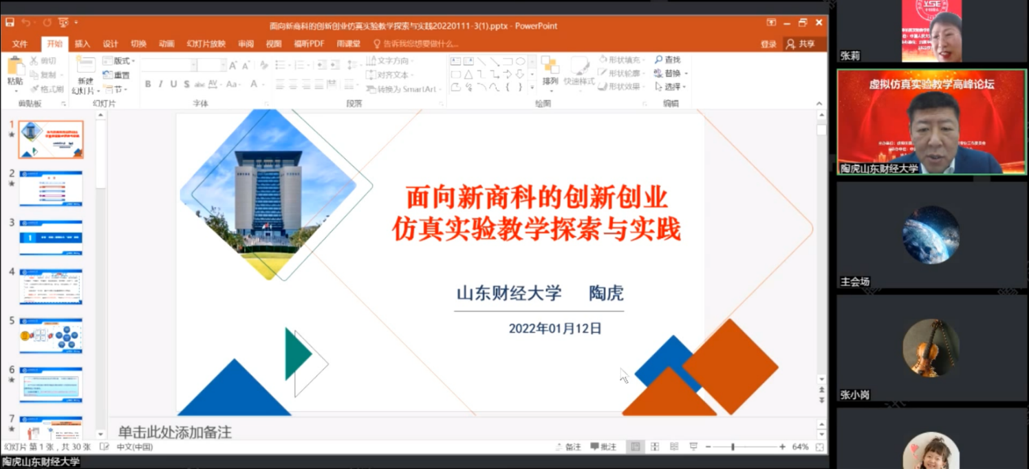 2022年1月12日,全国虚拟仿真实验教学创新联盟经济管理类专业工作委员会成立暨第一次工作会议以线上线下结合的方式成功召开。本次会议由联盟经济管理类专业工作委员会主办,中国人民大学经济与管理实验教学中心承办,150所高校和相关研究机构、企业的近220人线上线下参会。我校为首届经济管理类专业工作委员会会员单位,中心主任丛建阁教授出任该委员会委员,副校长陶虎受邀作了题为《面向新商科的创新创业仿真实验教学探索与实践》主题报告。中心李斌副主任和学院部分实验教师等人员线上参加了会议。