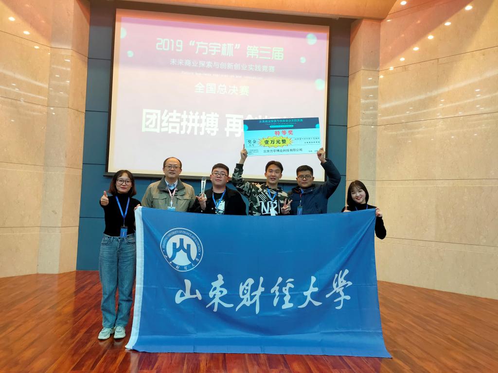 在工商管理学院毕继东和葛培波老师的指导下,依托学校实验教学中心提供的训练场所和技术支持,由工商管理学院2016级市场营销专业于凤祥、徐靖尧、楚静怡、陈亭及人力资源管理专业李宗键5位同学组成的山东财经大学“明德队”以第一名的优异成绩荣获全国总决赛唯一特等奖。