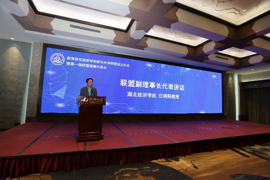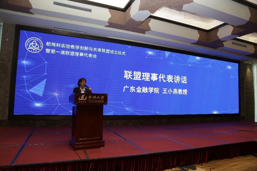 颁牌仪式后,联盟理事代表广东金融学院王小燕、联盟副理事长代表湖北经济学院任晓阳、联盟专家委员会主任山东大学戚桂杰分别上台发言,王小燕指出了目前实验教学领域存在的一些问题,如软件资源开发周期长、难度大、投入高;资源开发重复度高,商科实验教学课程资源建设缺乏体系化等。因此亟需对实验教学建设进行资源整合,步入校校合作、校企合作的生态发展。王小燕对联盟发起单位所建立的工作平台给予了高度评价,对未来携手共商共建共治共享优质商科资源寄予了厚望。
