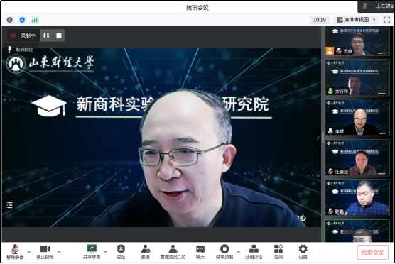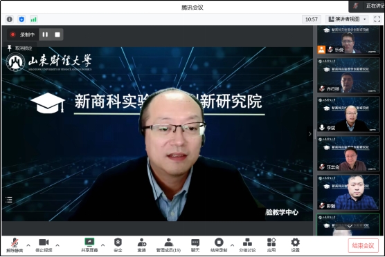 2022年11月11日下午,实验教学中心组织召开了山东财经大学新商科实验教学创新研究院(以下简称“研究院”)成立仪式,会议以线上腾讯会议形式举办。实验教学中心领导班子全体成员、实验教学中心原主任丛建阁教授、相关部门负责人,以及工商管理学院毕继东、会计学院牛艳芳、金融学院王俊籽、国际经贸学院邬彩霞、财政税务学院汪崇金、经济学院齐行祥参加了会议。会议由实验教学中心主任李斌主持。