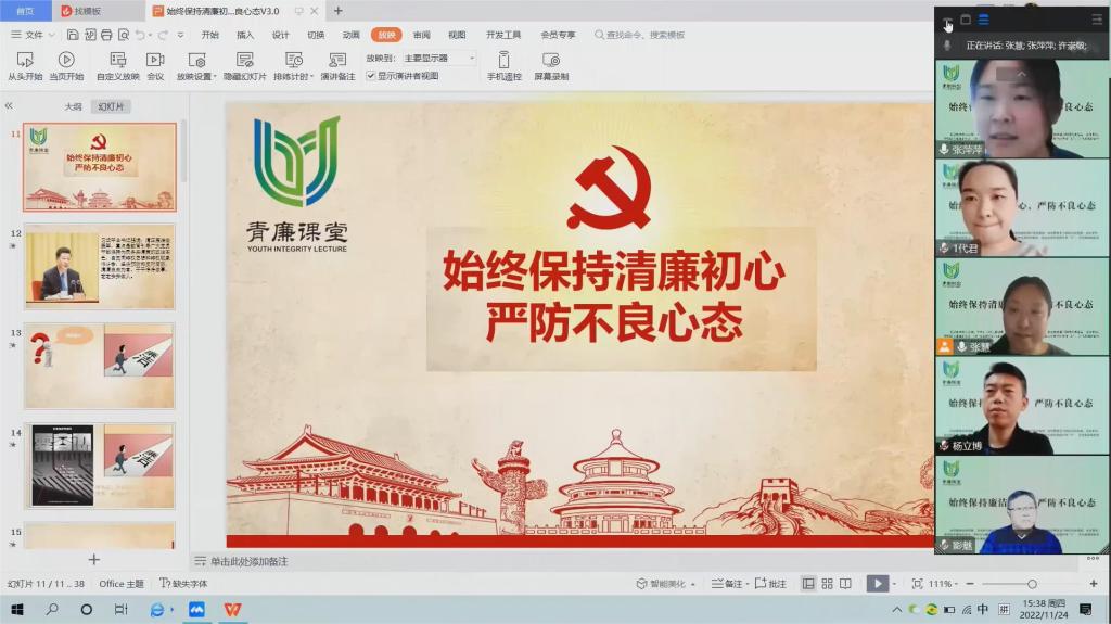 11月24日,实验教学中心为党员干部举办“青廉课堂”,第二党支部副书记张萍萍老师做了题为“始终保持清廉初心 严防不良心态”的专题讲座。中心党委书记张慧主持会议。
